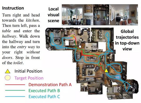 图 1:VLN 任务演示。图中展示了指令、局部视觉场景和俯视图的全局轨迹,智能体并不能获取俯视图信息。路径 A 是遵照指令的演示路径,路径 B 和 C 是智能体执行的两个不同路径。