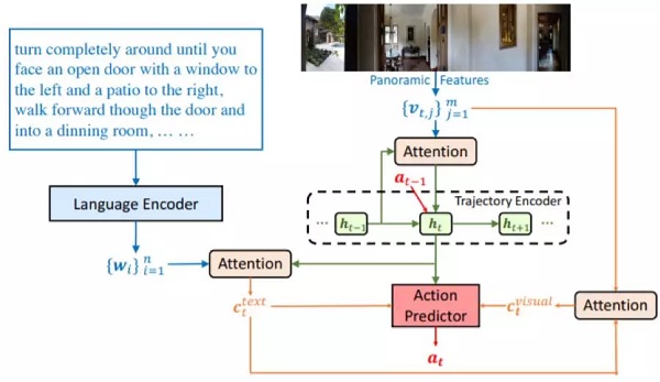 我们的推理导航器可学习跨模态的背景,基于轨迹历史、文本背景和视觉背景来做决策。