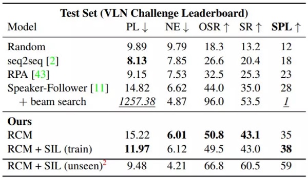 实验表明 RCM 能在 R2R 数据集上达到新的当前最佳表现,在 VLN Challenge 的 SPL 方面(该任务最可靠的指标)也优于之前的最佳方法,排名第一。