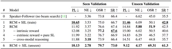 表 2:在见过的和未见过的验证集上的 ablation 研究。我们报告了没有波束搜索的 speaker-follower 模型的表现作为基准。第 1-5 行展示了通过从最终模型连续移除每个单个组件来展示其影响。第 6 行展示了 SIL 在使用自监督探索未见过的环境的结果。