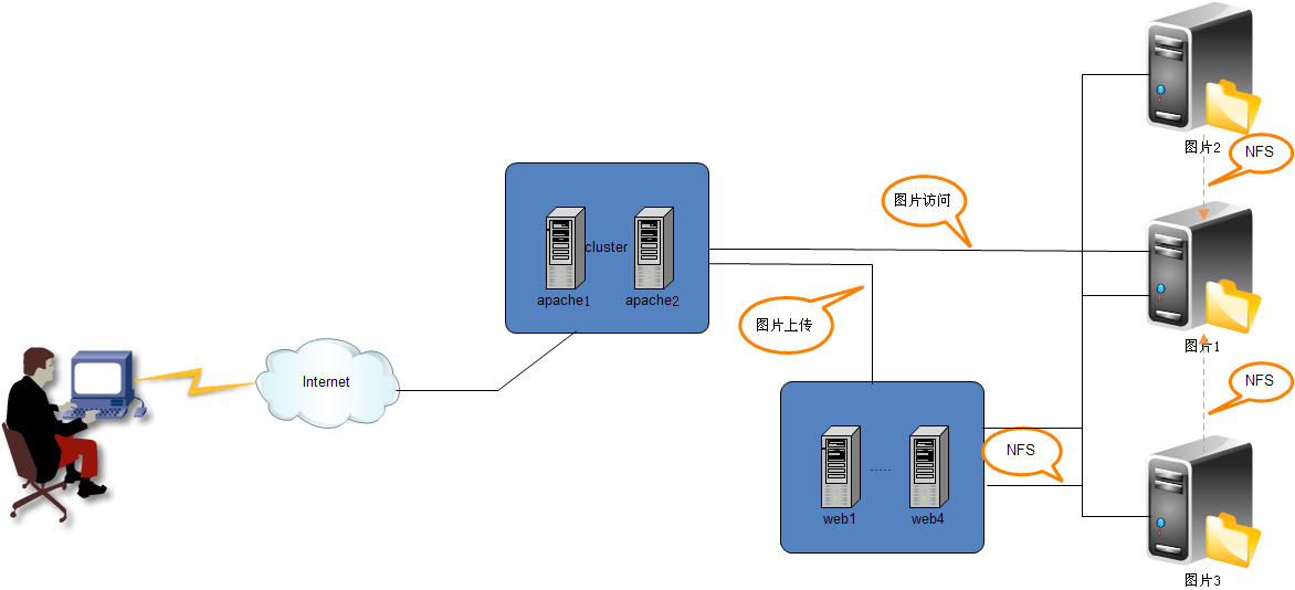 如果不想在每台图片服务器同步所有图片,那么NFS是最简单的文件共享方式。NFS是个分布式的客户机/服务器文件系统,NFS的实质在于用户间计算机的共享,用户可以联结到共享计算机并象访问本地硬盘一样访问共享计算机上的文件。具体实现思路是: