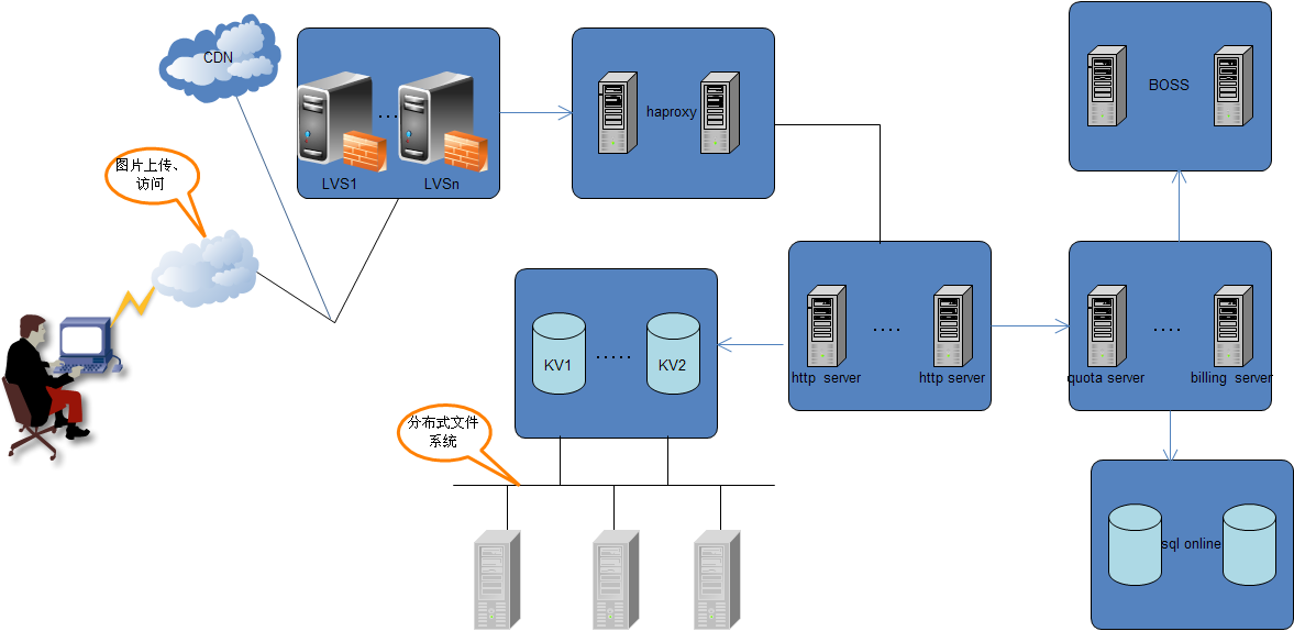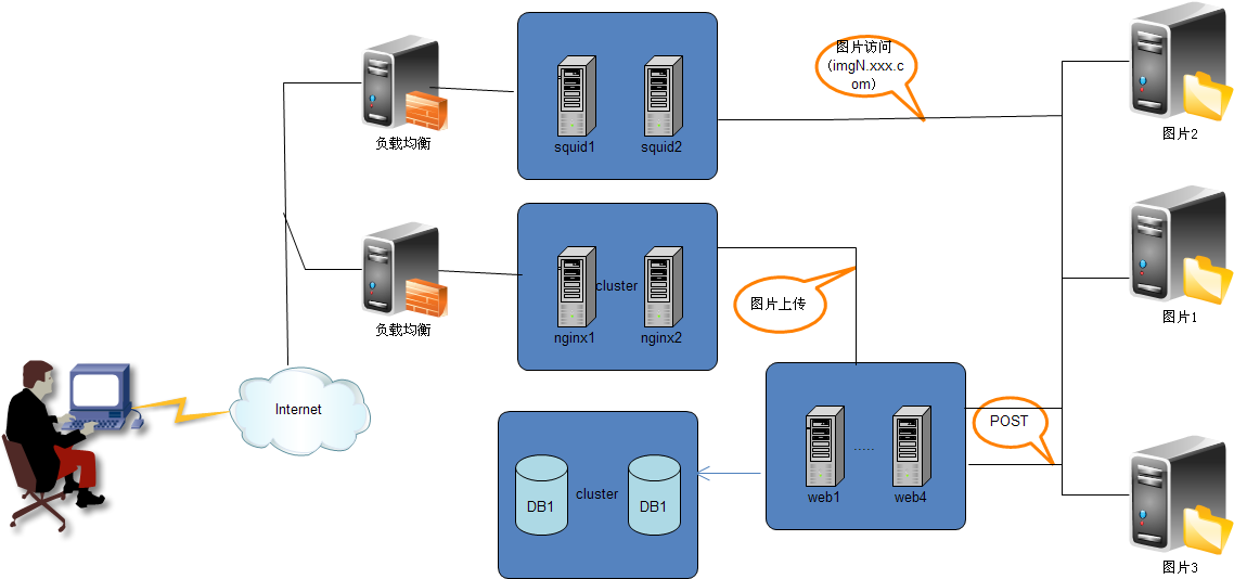 当网站达到一定的规模后,对图片服务器的性能和稳定性有一定的要求后,上述NFS图片服务架构面临着挑战,严重的依赖NFS,而且系统存在单点机器容易出现故障,需要对整体架构进行升级。于是出现了上图图片服务器架构,出现了分布式的图片存储。